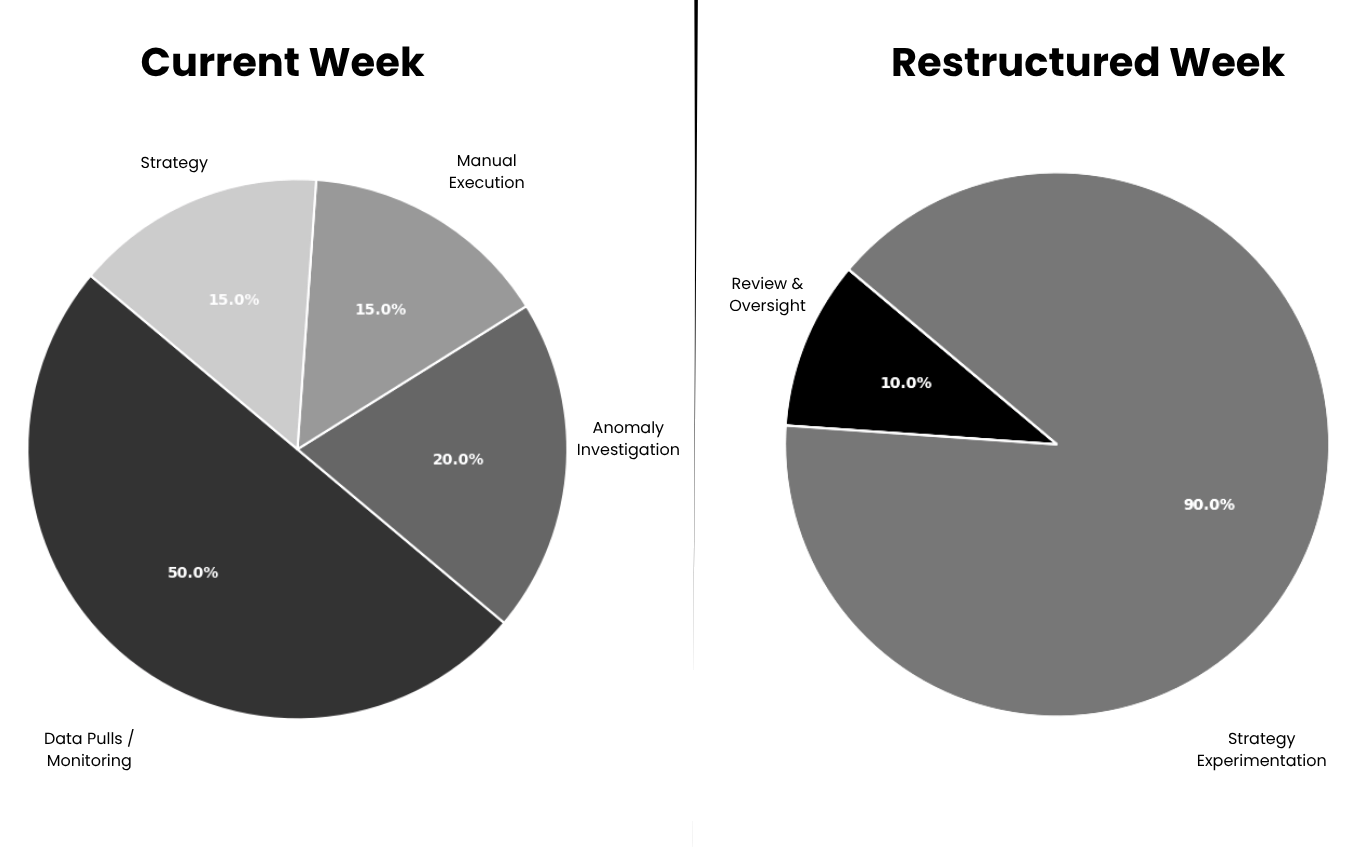The Account Manager still owns the same cognitive load. They still spend the majority of their week in reactive mode, pulling data, investigating performance drops, adjusting bids based on thresholds they already know. The AI tooling made the execution slightly faster. The underlying structure stayed the same.