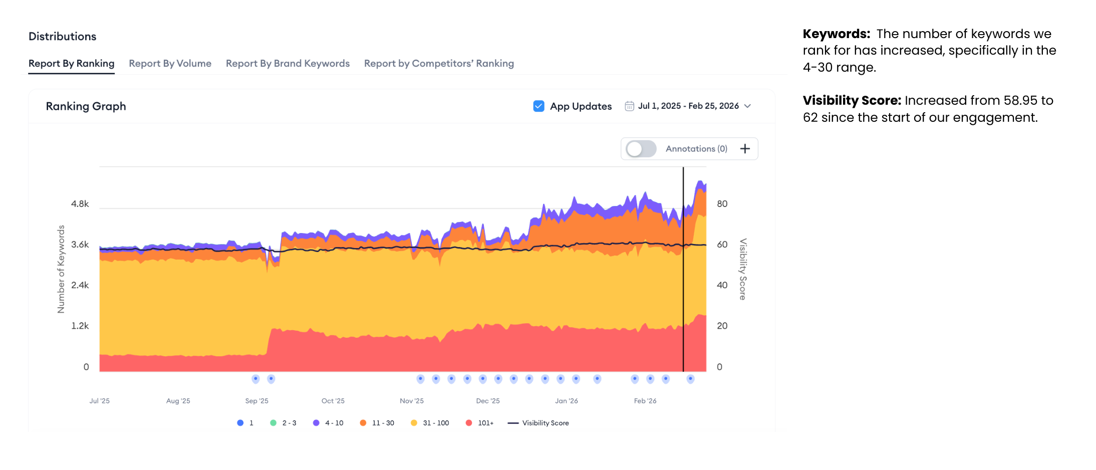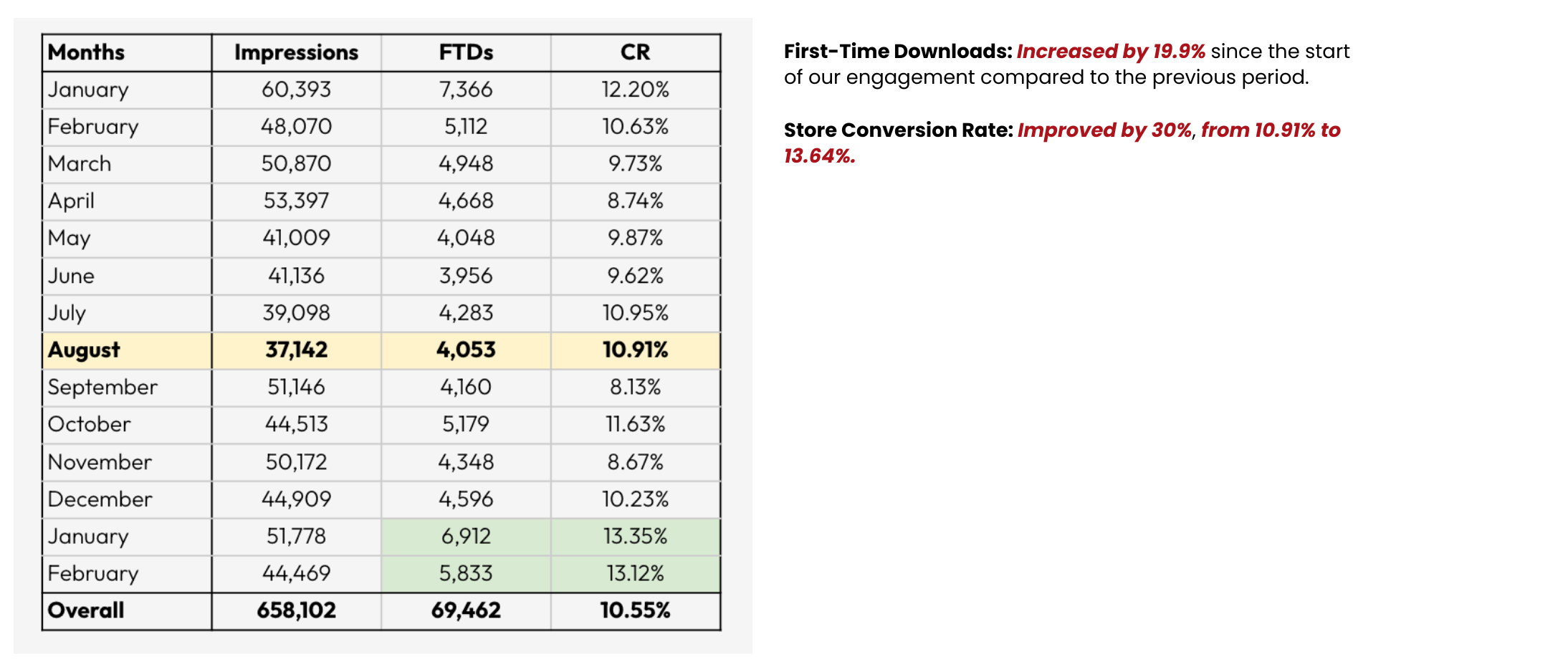 Keyword rankings grew from 3,600 to 4,900, with the strongest gains in the 4 to 30 position range. Visibility score increased from 58.95 to 62. First-time downloads grew by 19.9% compared to the prior equivalent period, and store conversion rate improved by 30%, from 10.91% to 13.64%, while impressions were scaling at the same time. Browse first-time downloads increased by more than 50%.