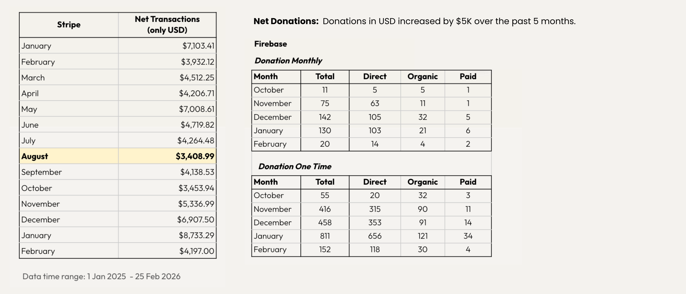 Donation volume increased consistently from November onward, with January 2026 reaching $8,733, the highest single month in the data window. Revenue and donation volume are both up year-over-year. The next phase focuses specifically on donation conversion optimization to deepen that impact.