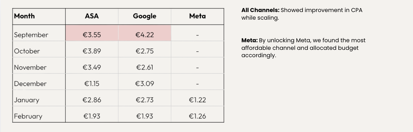 On the paid side, overall CPA improved from €3.76 to €1.53 as install volume scaled from 191 to over 1,200 per month. Meta delivered the lowest CPA at €1.26, with ASA and Google both reaching €1.93 by February. Every channel improved month over month.