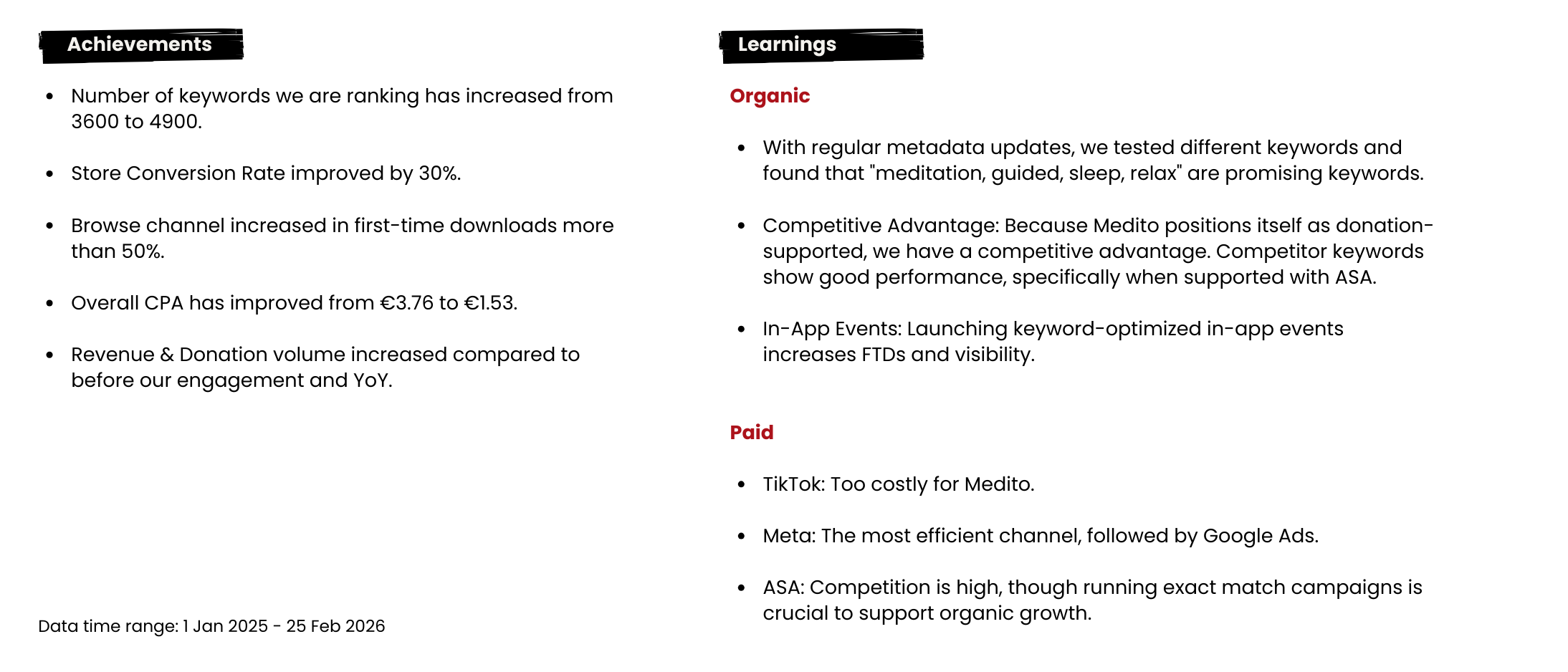 We ran regular metadata update cycles to systematically test keyword combinations, identifying "meditation," "guided," "sleep," and "relax" as the highest-signal clusters for Medito's audience. ASA exact match campaigns were layered on top of the organic work, using competitor and category keywords to accelerate ranking velocity across both channels simultaneously.